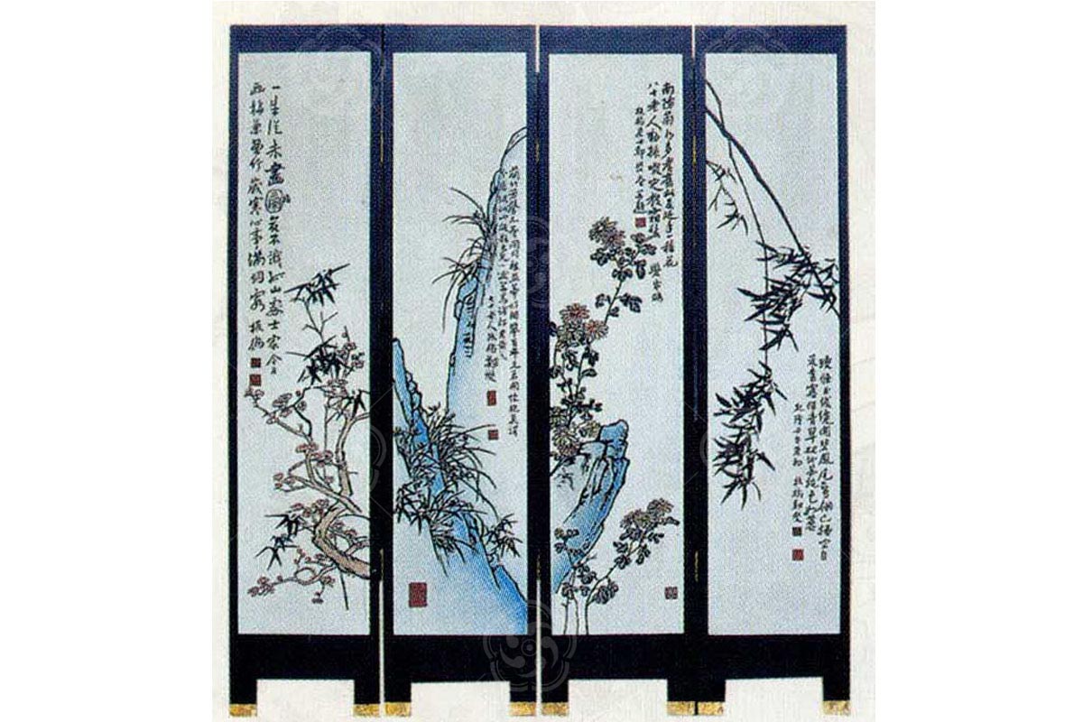 刻漆屏風屬于刻漆工藝的一種,該工藝強調橫平豎直,充分體現刻漆工藝的難度,色彩對比強烈,又不失和諧。